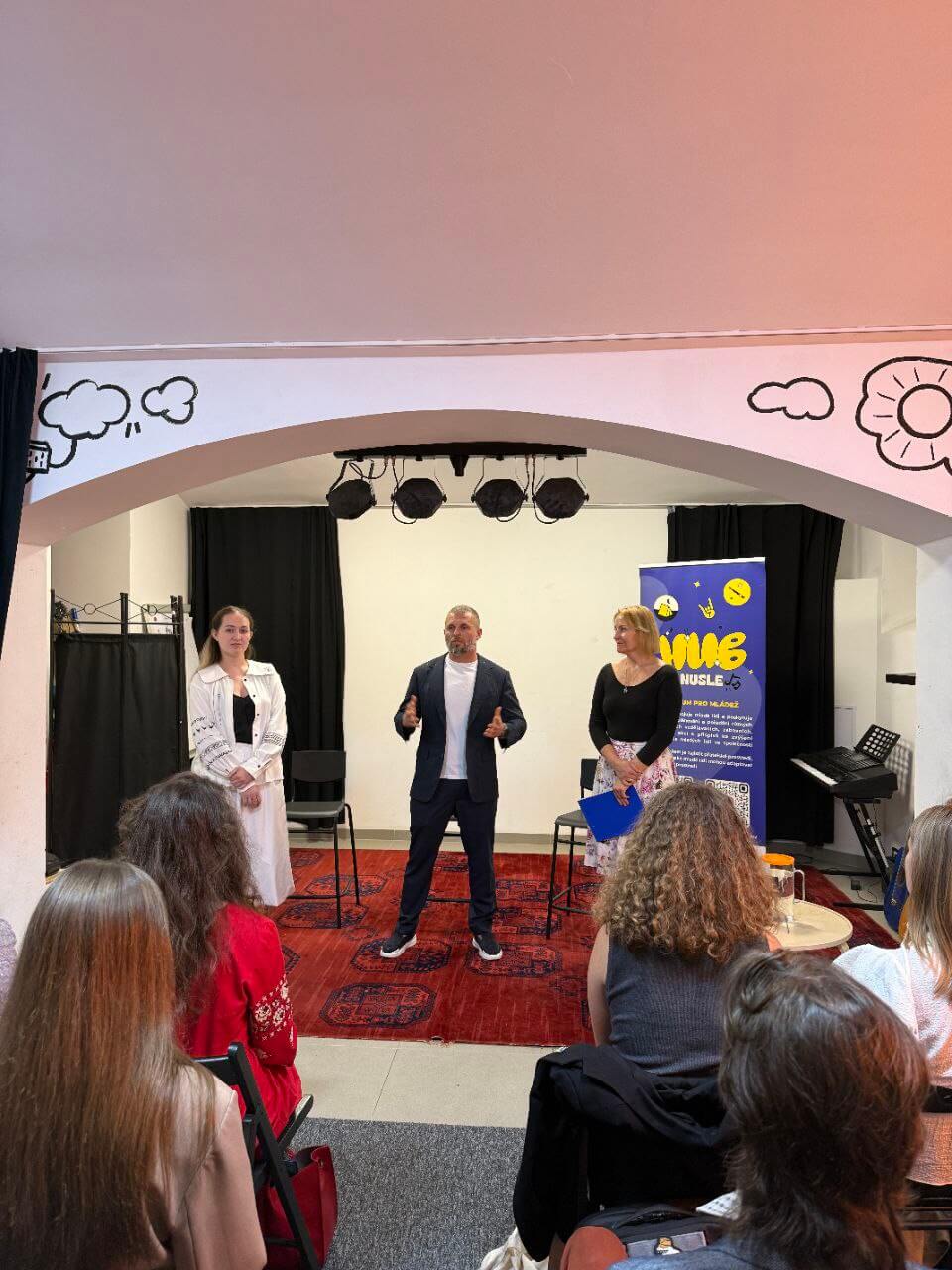 А до початку сесії запитань від молоді та відповідей на них пані Галина Андрейців, керівниця Празького Майдану та Hub Nusle, та пані Людмила Коросташевич, менеджерка Hub Nusle, розповіли про простір, який прийняв подію.