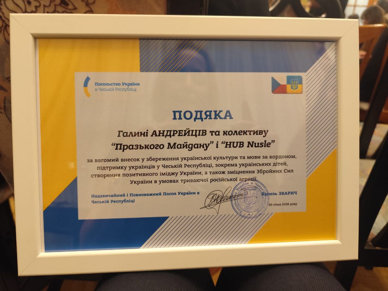 Щиро дякуємо пану Послу Василю Зваричу за високу оцінку нашої діяльності та довіру. Ми й надалі працюватимемо задля підтримки української громади, розвитку культурних і освітніх проєктів та зміцнення української присутності в Чеській Республіці.